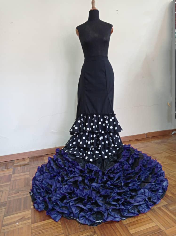 Tiene en total 16mts de tela, 4 mts de cordon de algodon. La cola tiene una amplitud de 160cm con un peso de 2,700gr